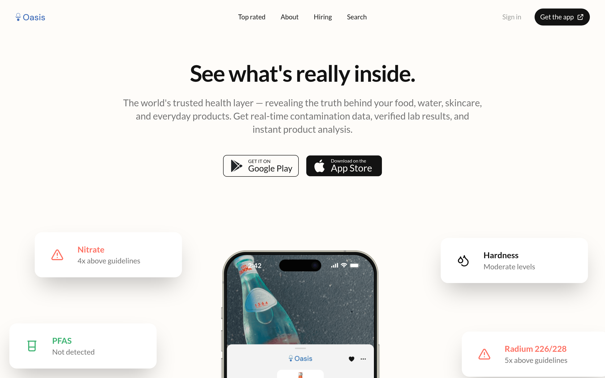 Oasis is a consumer safety platform that provides transparency about contaminants and ingredients in everyday products. The service helps consumers make informed purchasing decisions by revealing potential health risks in food, water, skincare, and household items through independent lab testing and verified research data.